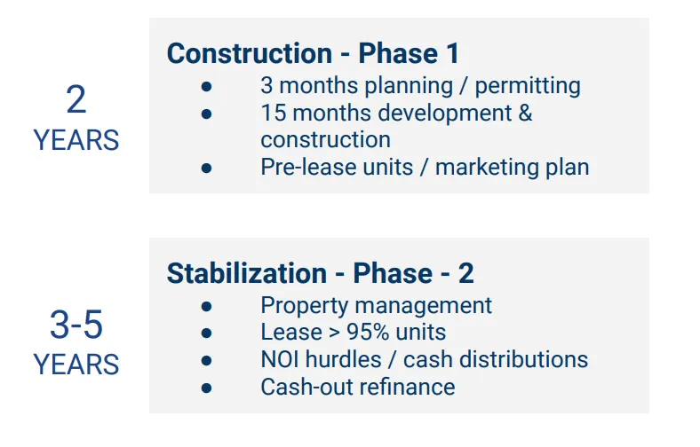 The sponsors anticipates to return investor equity, plus a preferred return, upon stabilization through a cash-out refinance. A single-purpose LLC will be formed to hold the asset and a limited partnership will be formed to constitute investor capital.